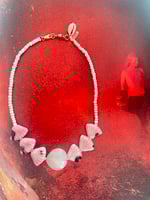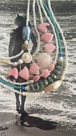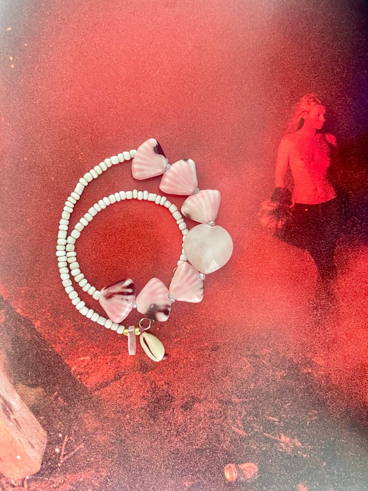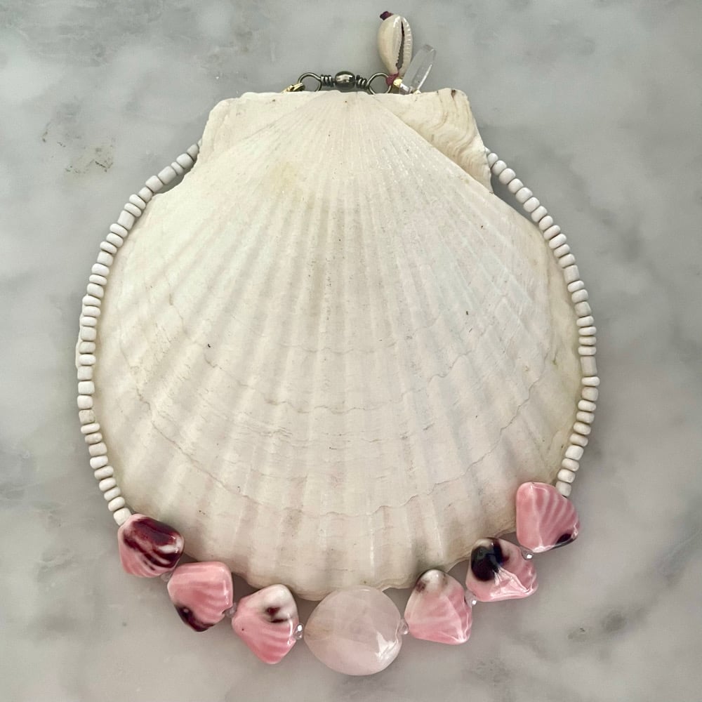 A selection of hand glazed pink ceramic fan shells set between milky faceted Swarovski crystals. Worn as a cropped style / anklet / bracelet . each piece personally hand made slowly . Only two made . X from my heart to yours.