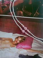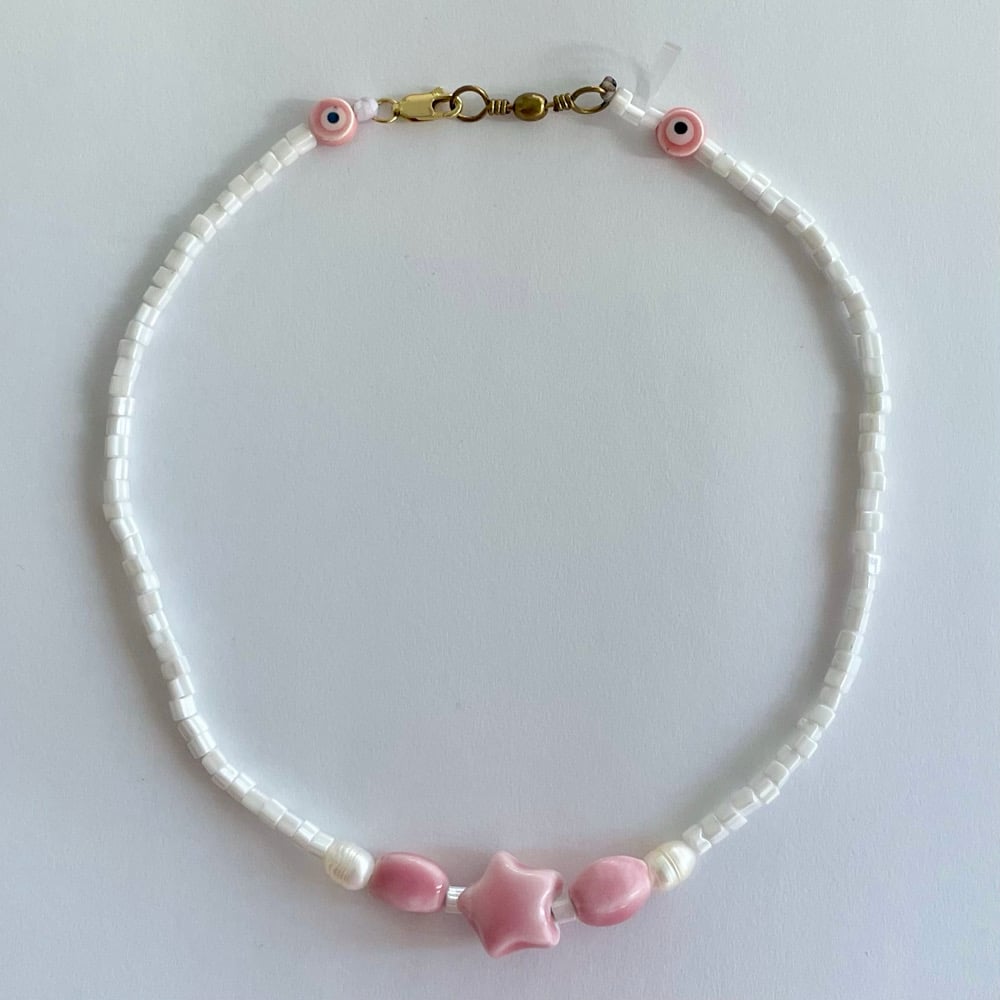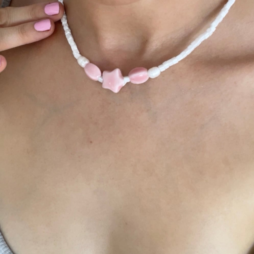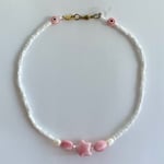 Worn cropped as a necklace or wrapped on the wrist at 41 cm in length. Hand glazed ceramic pink beads mixed with glossy white glass beads finished with pearls .